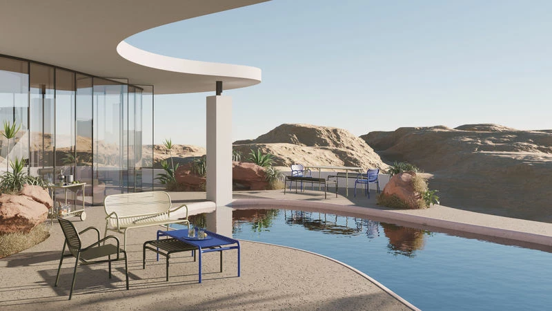 The WEEK-END collection is a full range of outdoor furniture. Designed with practicality in mind, all of the seats are stackable. The Week-End collection is a complete range of outdoor furniture. The oval and circular shape drawn by the backrests makes them a graphic statement. The impact of the horizontal and vertical slats, so similar to stripes, highlights the full and empty spaces, asserting the identity of the collection. The WEEK-END collection includes seats – a chair, a bridge, an armchair, -, tables – a coffee table, a square table for 2-4 people, a large dining table for 6-8 people.