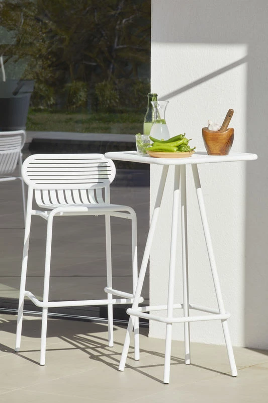 Cheerful, colourful and graphic, the Week-End collection brings life to your garden! This aluminium furniture is lightweight, mobile, easy to handle, and robust: a perfect collection for creating a modern outdoor lounge or a nice dining area on a terrace or in a kitchen. Every piece is water-resistant and UV-resistant, and can be used by the seaside. The Week-End collection was designed by French studio BrichetZiegler. The oval, encircled shape creates the backrests so that they become a graphic sign. The work of the horizontal and vertical slats, like stripes, emphasises the full and empty spaces, affirming the collection’s identity. As pretty as it is functional, the Week-End collection has been designed for practical use: all of the seats are stackable. The ergonomic shapes are all about user comfort and their individual postures. This aluminium barstool embodies the concept of a sustainable product: corrosion-resistant, reinforced slats, this armchair has been designed to withstand the tests of time. Can be accessorised with 1 SMALL seat cushion. Thanks to the wide colour range, combining muted tones and bold colours, Week-End enables you to create unique and daring outdoor compositions.
