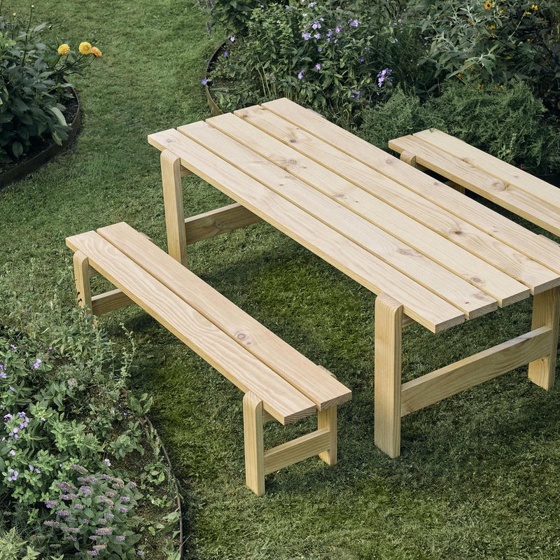 Working between Stuttgart and Zurich, the Hannes&Fritz studio brings together two talented young designers: Hannes Breuer and Fritz Gräber. Their collection of Weekday outdoor furniture comes from their eco-responsible project “Bench TWO” created in a few copies. This two-person bench with its reduced dimensions has been made from a single 3-metre-long pine plank, using all the wood with no waste. The narrower dimensions than traditional benches allow it to be used even in the narrowest spaces without losing seating comfort. In collaboration with Hay, the designers from the Hannes&Fritz studio have expanded their project by creating a complete collection of benches and tables for outdoors to create a designer, original, durable dining area in your garden. These pieces of furniture are all made of FSC™-certified solid pine with a zero waste objective in the manufacturing process. The cutting of the boards has been perfectly designed to avoid any useless offcuts of wood. The wood is painted with an eco-friendly water-based outdoor lacquer. The seats and tops are made of planks supported by a base with solid lines. These pieces of furniture have a humble, familiar appearance. The rigorous, strict forms are associated with a pretty palette of fresh colours. The Weekday collection features a mix of joyful intensity and remarkable sobriety, poetry and geometry. The benches can be accessorised with cushions sold separately.