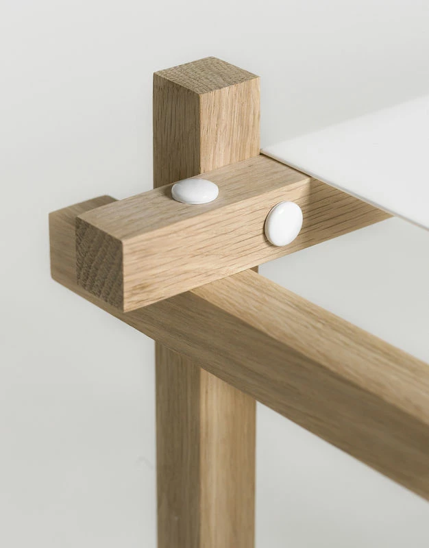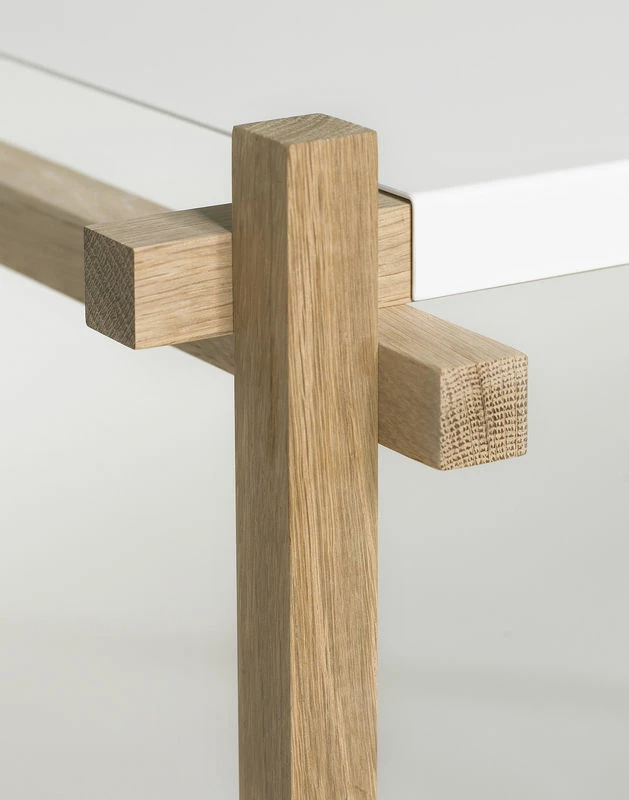 Woody is a modern interpretation of traditional ladder inspired shelving systems. With no apparent front and back it works well as a free standing piece of furniture as well as against a wall. One of the greatest strengths of the shelving system is the thorough simplicity which emanates from the idea that a shelving system should not be too visually dominant and should leave room for the items placed in it. Woody is created in the spirit of modernism. Nothing in the construction is hidden, all joints are visible and all parts are industrially manufactured. Simplifying and updating more traditional shelving systems has been a key element in the development of Woody which simply consists of oak sticks, bent steel and screws. At the same time great effort has been put into perfecting the joints in terms of form and strength. Solid oak is an incredibly strong material and it ages beautifully, so in spite of the lightness in its appearance, the structure is surprisingly strong and stable compared to other shelving systems of this type.The light soap treated oak provides Woody with a traditional Scandinavian expression, which is updated by the contrasting steel shelves. The shelves lie freely on the wooden frame.