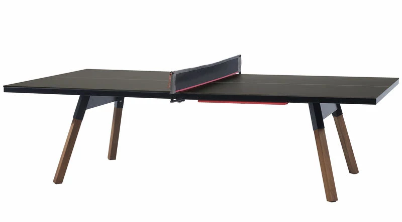 It's a ping-pong table. Standard sized, with a surface, a design, and a structure which gives it full playability. But, it is also a large dining table, a conference table just right for the board room, or whatever you want. All the sportiness that it gets from the net, the bats, and the balls, can be put in the side drawer and hidden away completely. Built from high-quality materials, it has been made for either indoor or outdoor use. Black finnish for outdoor covered use. The black colored table tennis table should be used in exterior covered and with protective cover to prevent discoloration by the sun