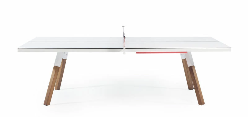 Y&M is a 2-in-1 table of exceptional XXL size (L 274 x W 152.5 cm) – perfect for family or friends gatherings and chic festive celebrations, whether in or outside. When the meal is finished, Y&M turns into a standard-sized ping-pong table in the twinkling of an eye! There is a coral lacquered steel compartment hidden under the table top, providing storage for all ping-pong accessories (included): removable net, bats and balls. When the net has been set and you have the bats ready in your hands – that’s the perfect time to start a match! Cool, festive and easy to use, this table smells like holidays and games; a must-have in any garden! Ideal for a primary or secondary residence, indoors or outdoors. This table is also perfect for reception halls and relaxation rooms. Moreover, it can be used as a meeting table in a company and then during a break, employees can relax by playing a table tennis match! Y&M table is made of high quality material with exceptional finishes; legs are made of Iroko wood. The HPL tabletop has black edges and two black lines in the middle for a sporty look. However, these original features are not there for aesthetic reasons only – they delimit the playing area of this ping-pong table.